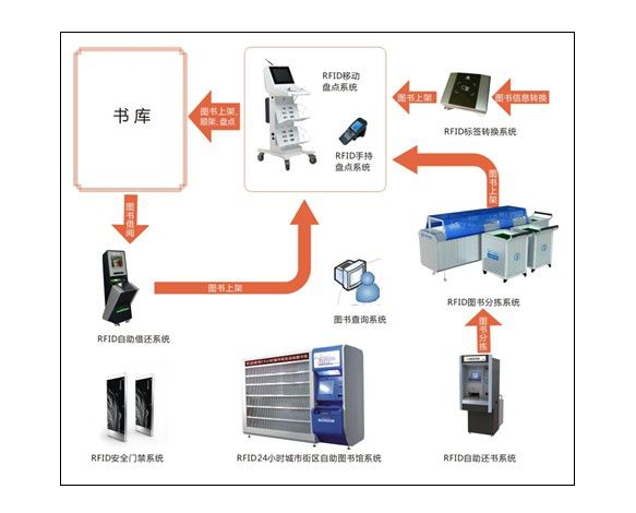 Sistem pengurusan buku RFID termasuk sistem pemindahan tag, sistem pinjaman bantuan kendiri, sistem pemulangan bantuan kendiri, sistem carian pintar, sistem inventori kereta tolak, sistem pemeriksaan pintu pagar selamat.